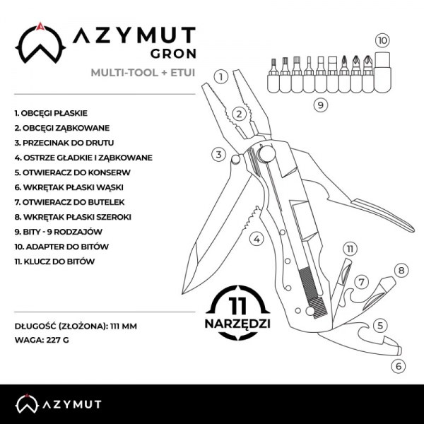 Narzędzie Wielofunkcyjne Multitool AZYMUT Gron - 11 narzędzi + 9 bitów + Etui